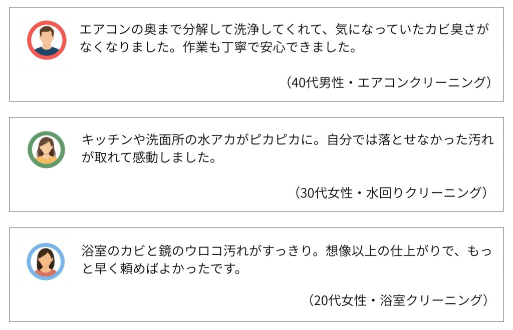 実際、エアコンクリーニングでは「内部まで徹底洗浄してくれた」、水回りや浴室では「長年の汚れがすっきり落ちた」といった声が多く見られます。プロならではの技術力を実感したという声も少なくありません。