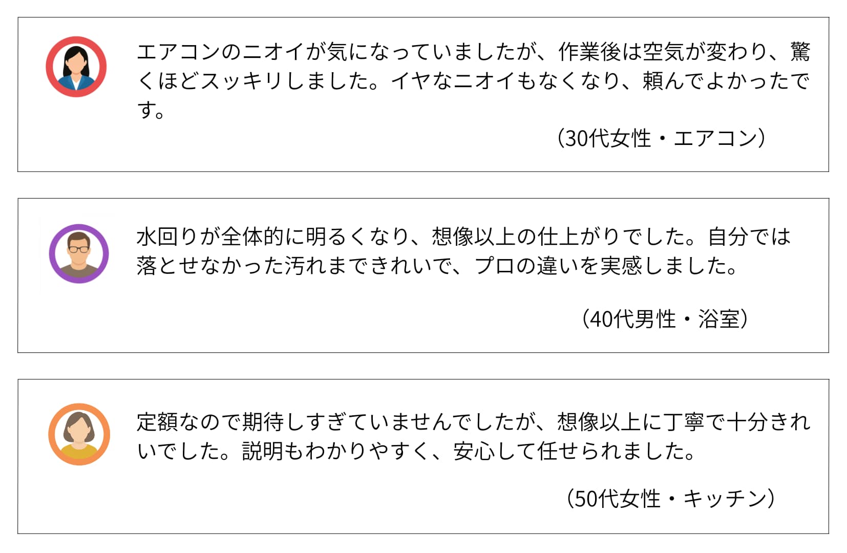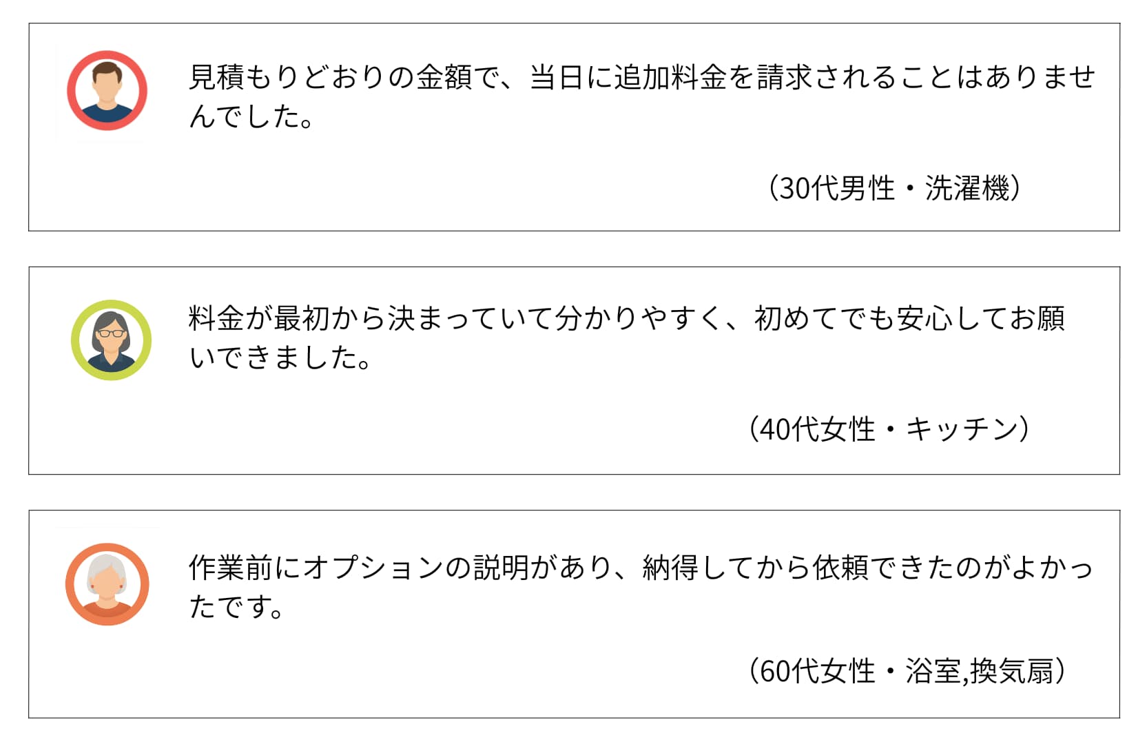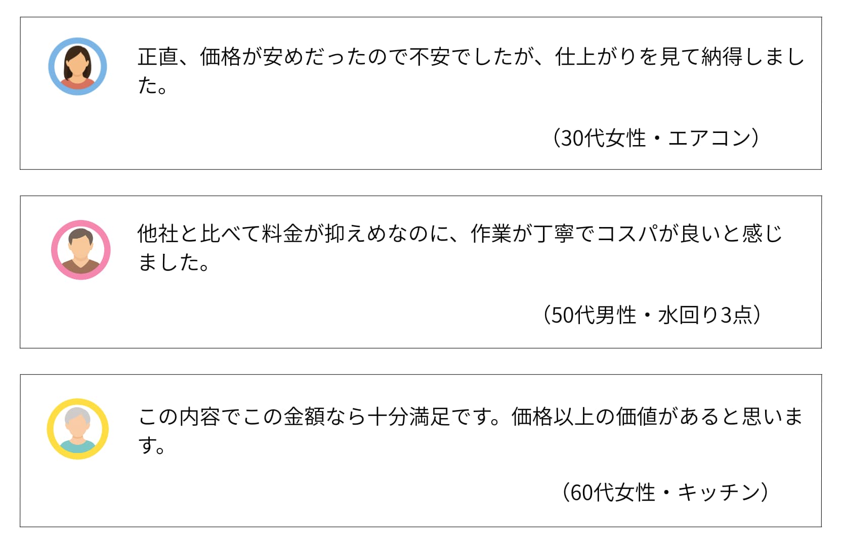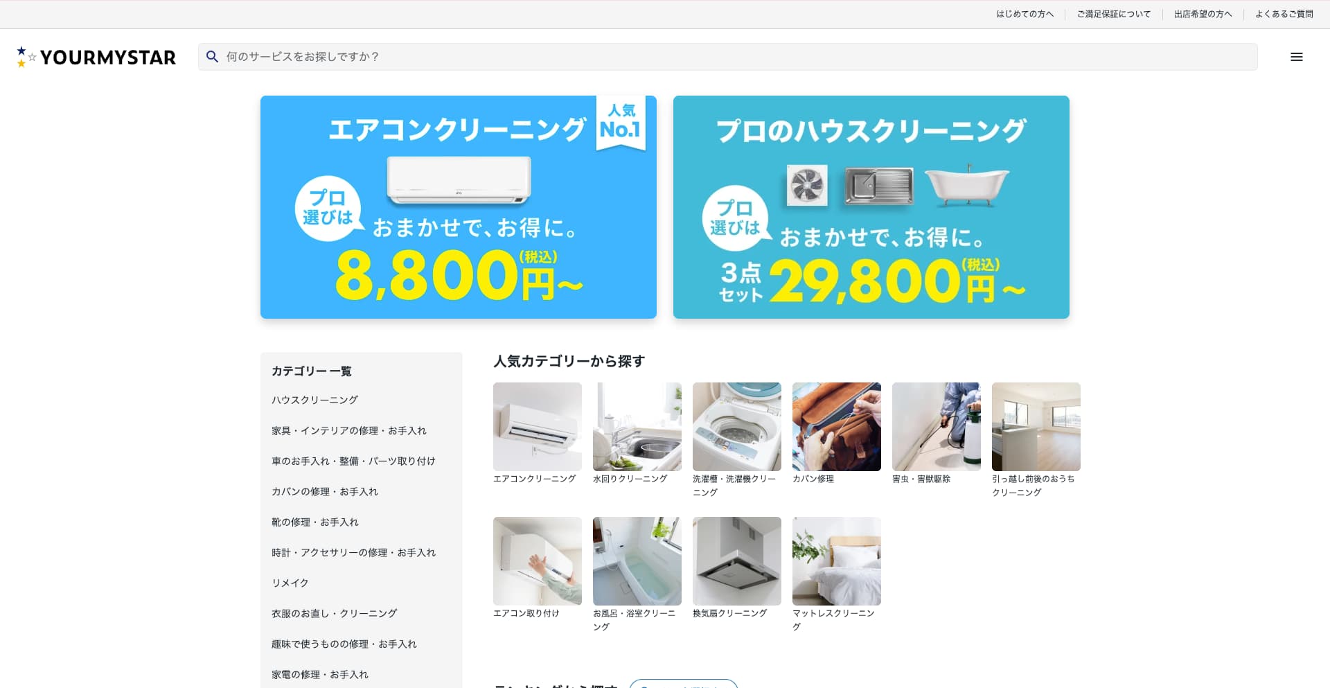 | 費用感 | 浴室:16,500円〜 エアコン:10,000円〜 トイレ:5,500円〜 |