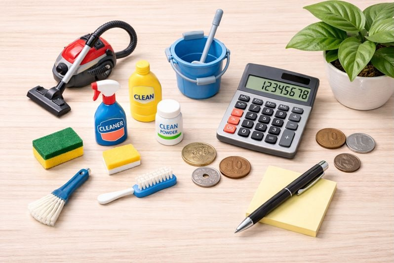 セルフクリーニングは最も費用がかからない方法で、必要なのは洗剤や道具代のみです。例えば、トイレ掃除は洗剤・ブラシ等で数百円〜1,000円程度、キッチン掃除は重曹やクレンザー、スポンジなどで500円〜1,500円、浴室掃除はカビ取り剤・洗剤・ブラシなどで1,000円程度。ただし、手間と時間がかかり、汚れの落ちに限界があるのがデメリットです。