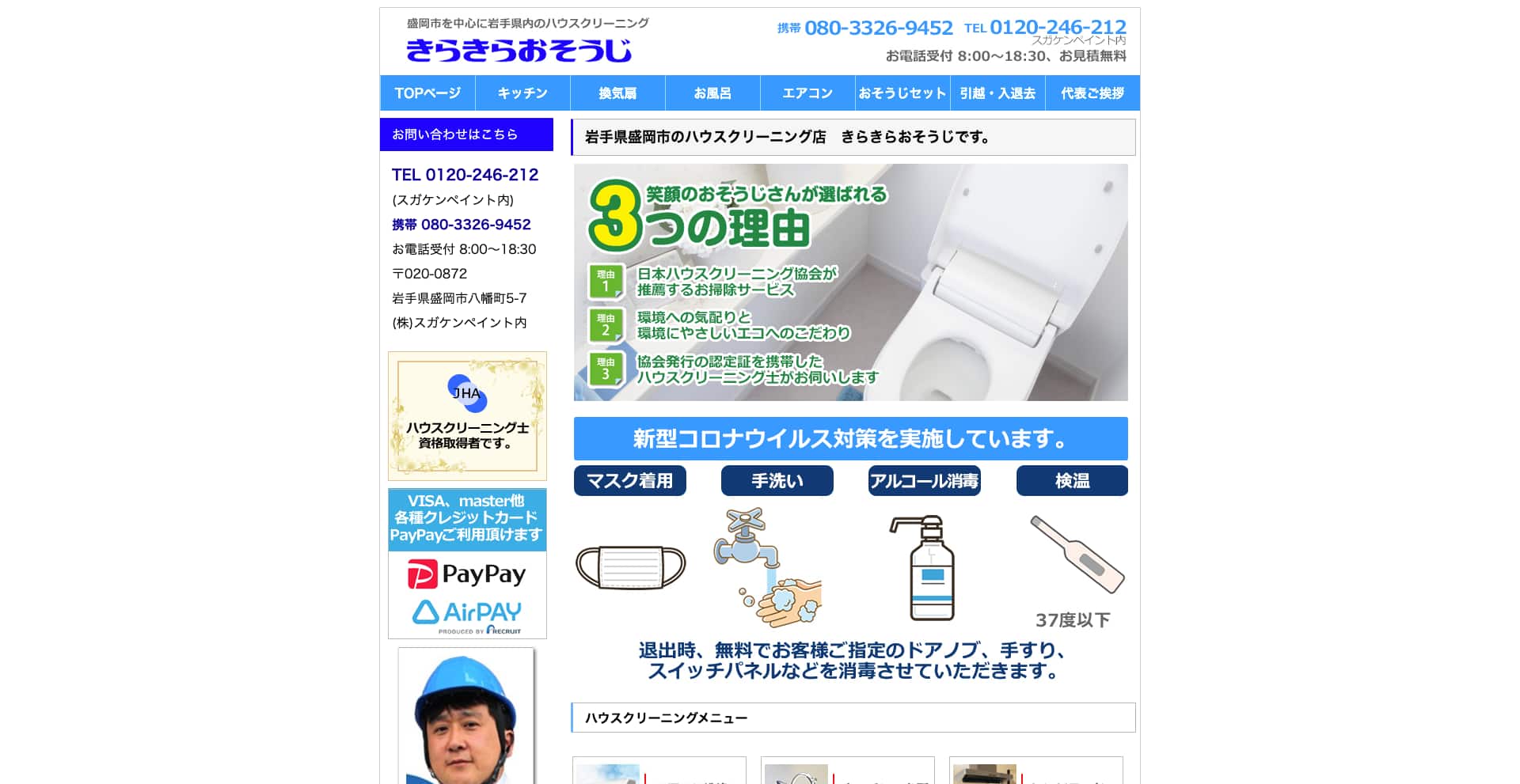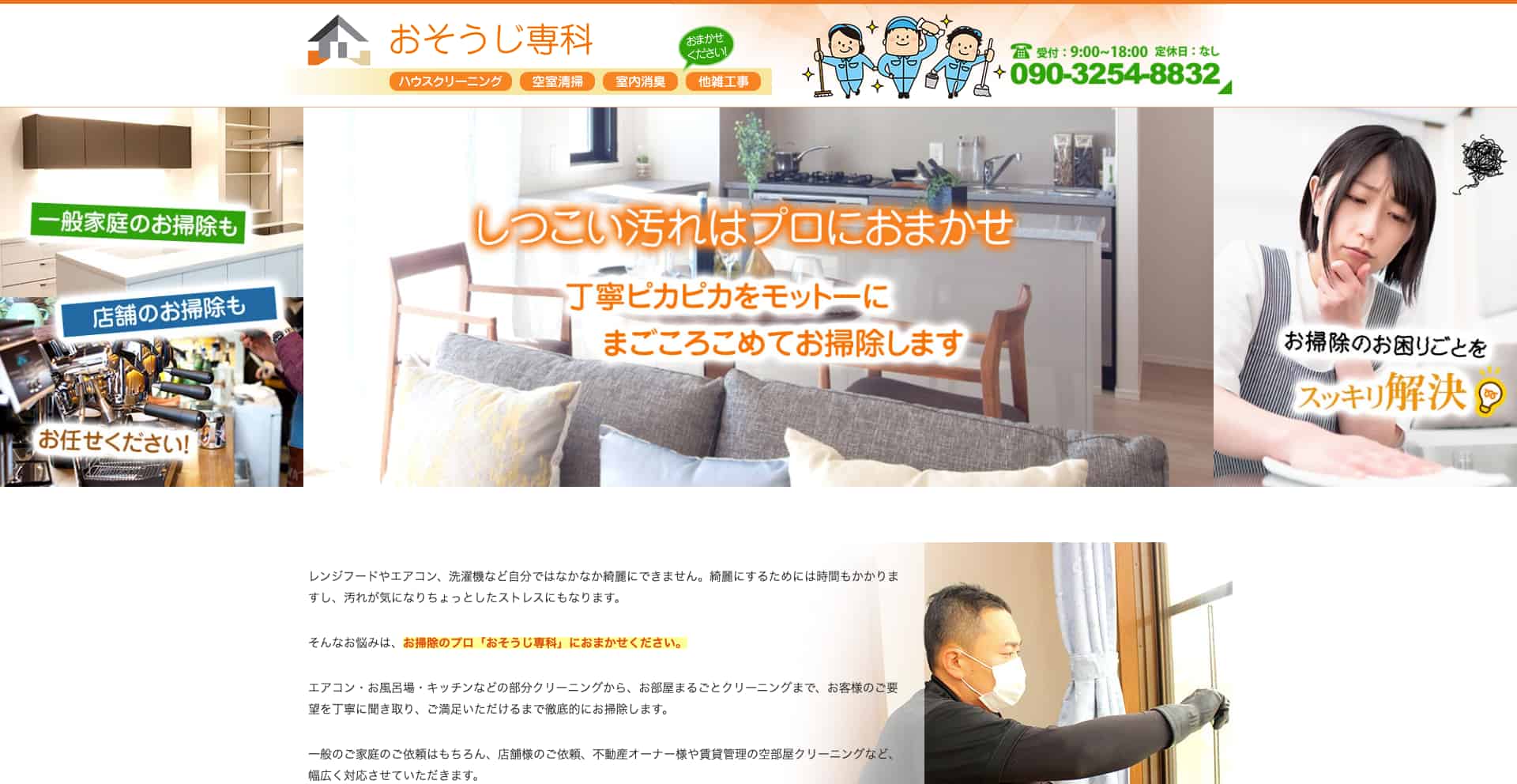 | サービス内容 | エアコン、浴室、キッチン、レンジフード、トイレ、洗面所、床、窓・サッシなど |