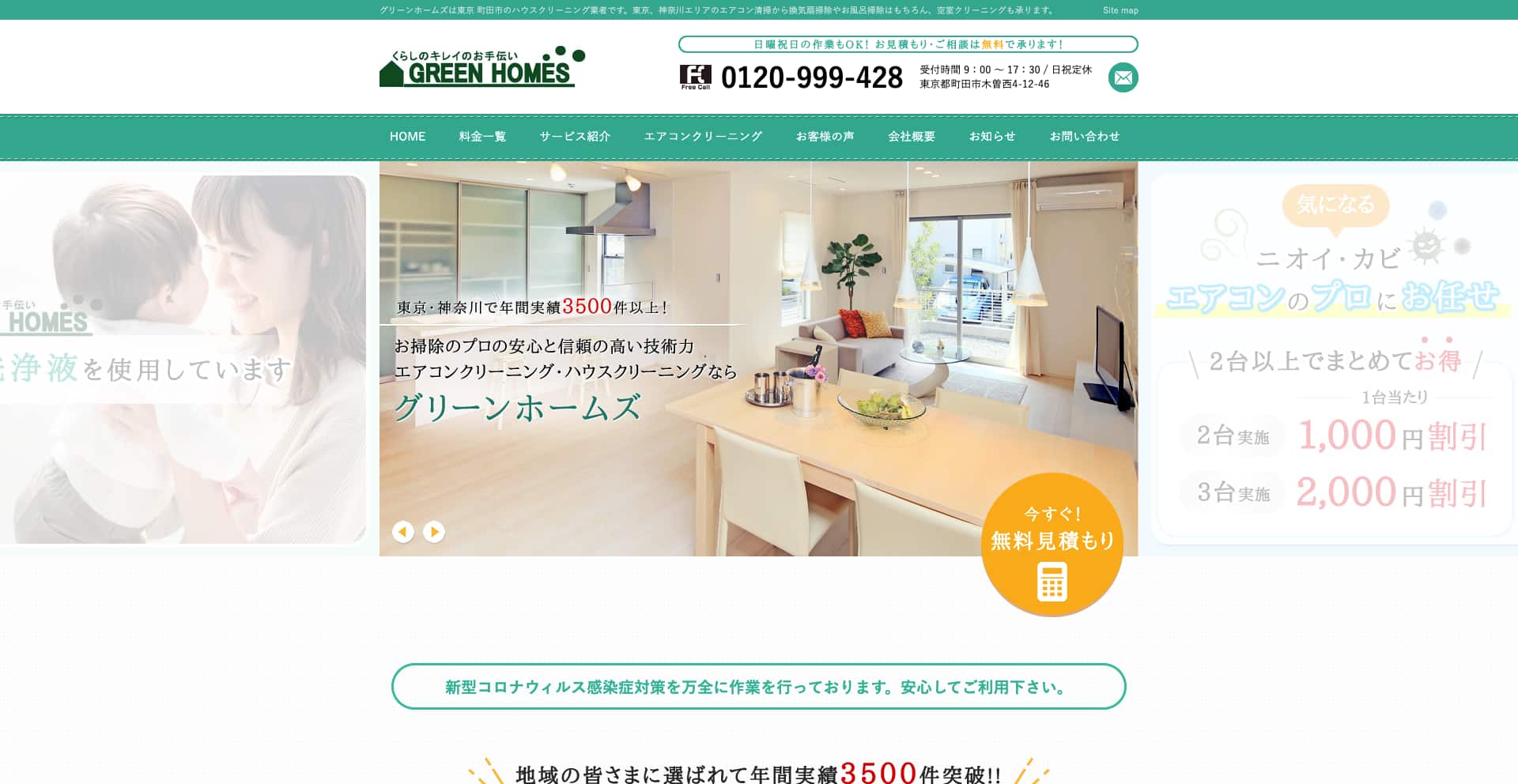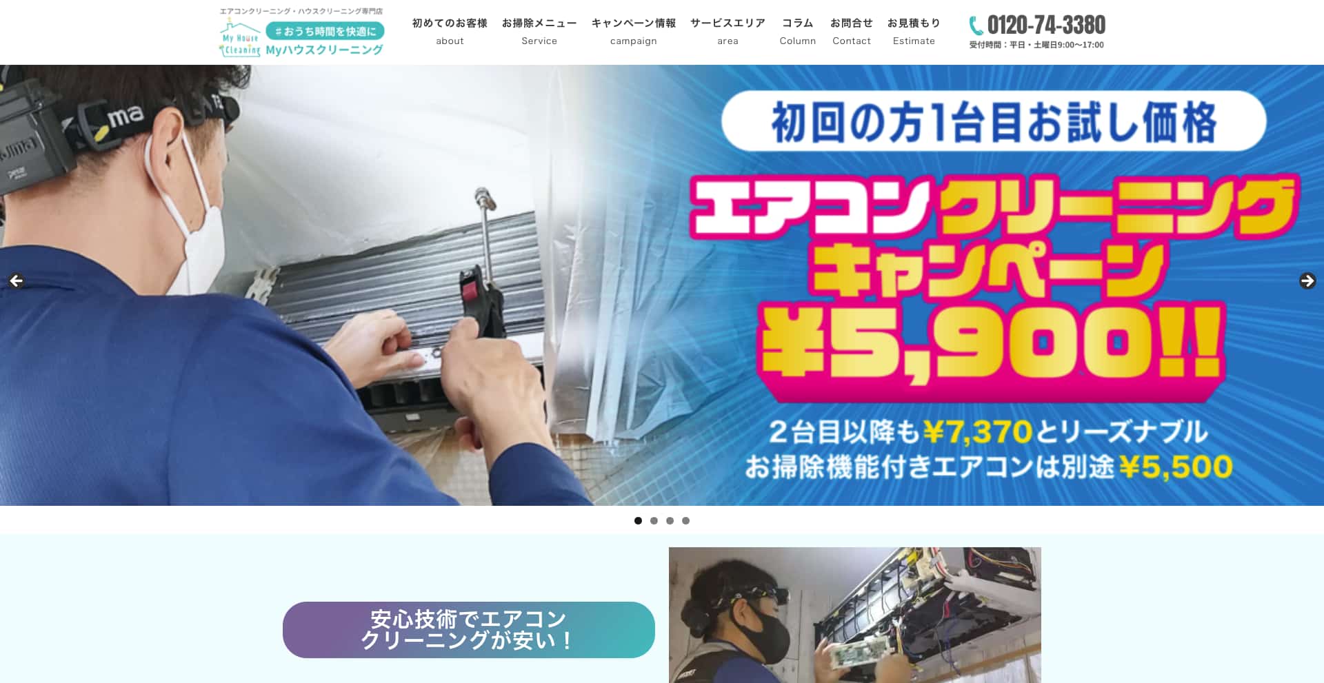 | 費用感 | 洗濯機:15,800円〜 浴室:13,800円〜 エアコン:9,800円 トイレ:9,500円〜 |