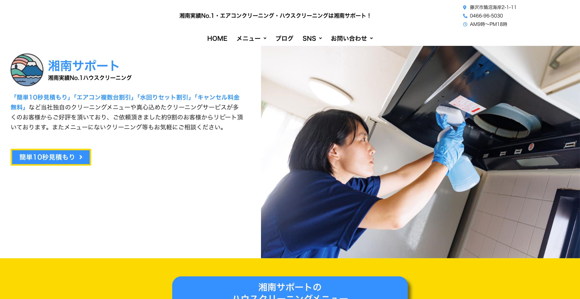 「湘南サポート」は、神奈川県藤沢市を拠点に、“湘南エリアで実績No.1”のハウスクリーニングサービスを提供しています。20年にわたるクリーニング経験と地域密着の丁寧な対応で、キッチン・浴室・トイレ・エアコンなどの水回り全般から、レンジフード、窓・網戸・サッシの清掃まで「家まるごとキレイ」にするトータルケアが特長です。