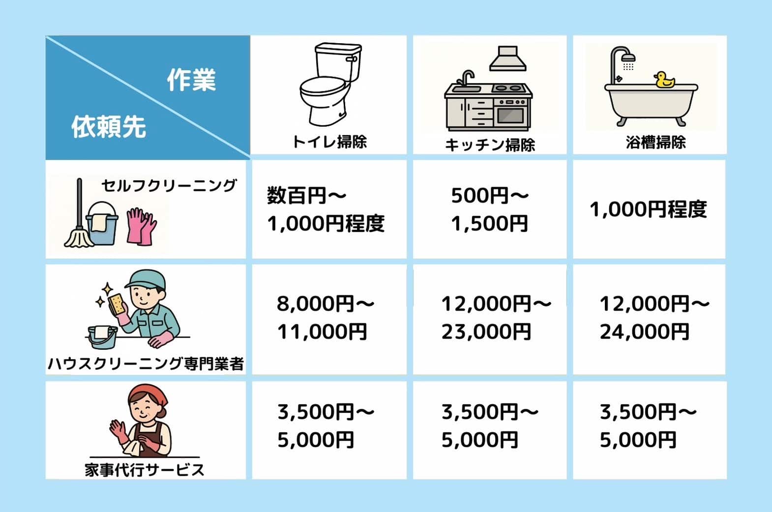 料金はあくまで目安で、作業範囲や汚れの程度によって前後します。依頼前には必ず見積もりを取り、追加費用の有無や作業範囲も確認しておくと安心です。